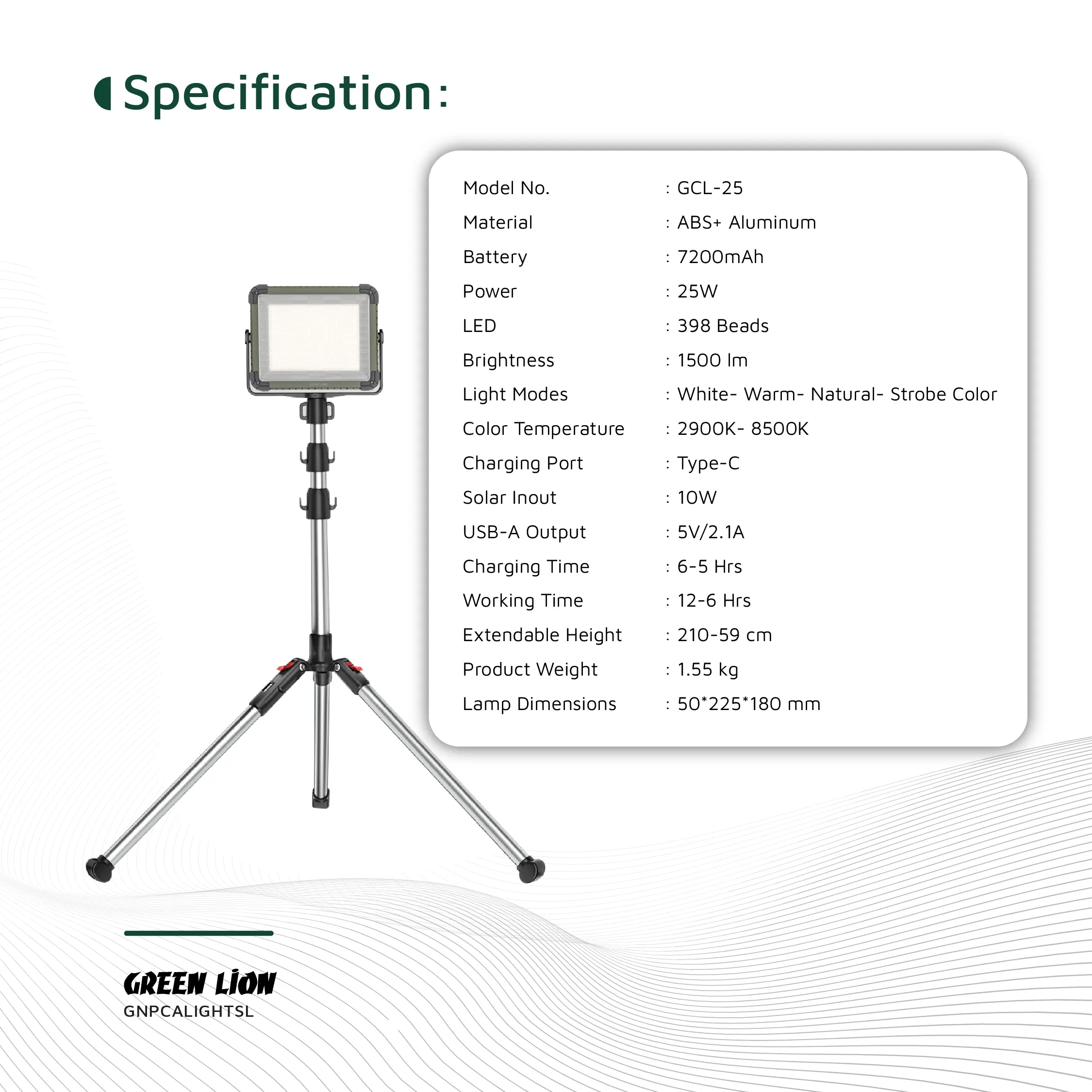 چراغ خورشیدی Green Lion Solar Light با باتری 7200mAh و توان خروجی ۲۵ وات یک گزینه کاربردی و ایدهآل برای سفرها و کمپینگ است. بدنه این محصول از ترکیب آلومینیوم و پلاستیک مقاوم ABS ساخته شده تا دوام و طول عمر بالایی داشته باشد.