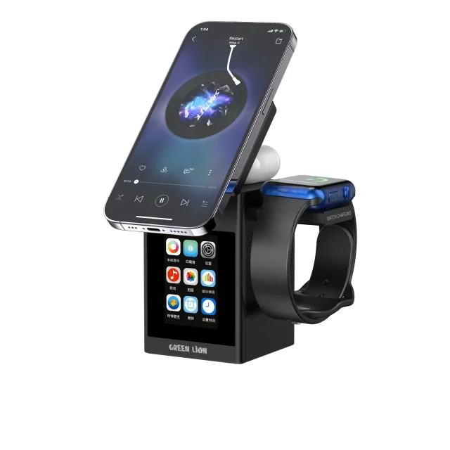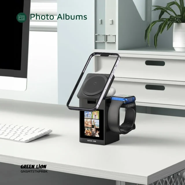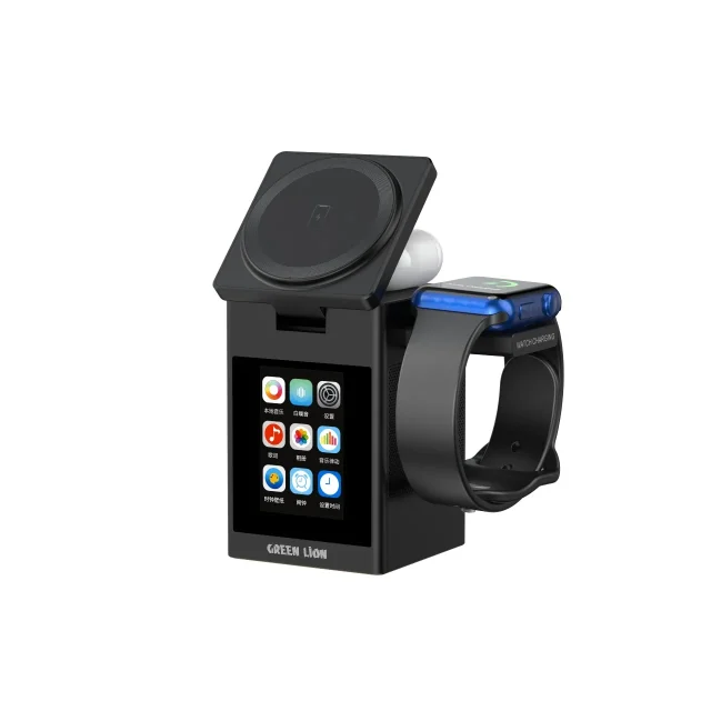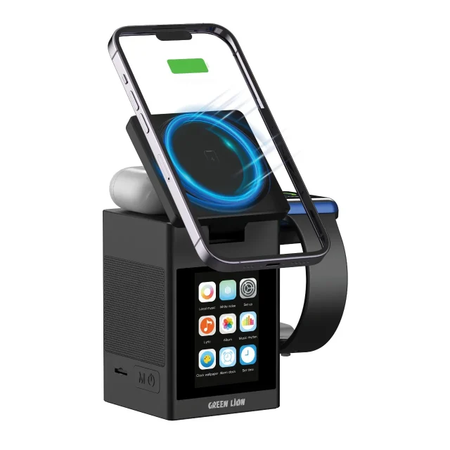 شارژر بیسیم Green Lion Smart Station Pro LCD Display با اسپیکر، ترکیبی از خلاقیت و کاربردیبودن را ارائه میدهد. این محصول از مواد مقاوم ABS + PC + سیلیکون ساخته شده و به کمک آهنرباهای قدرتمند N52 اتصال مطمئنی به گوشی ایجاد میکند. شارژر از چندین خروجی پشتیبانی میکند: 15W، 10W، ۷.5W و 5W برای گوشی، ۲.5W برای ساعت و 5W برای ایربادز که تضمینکننده شارژ سریع و پایدار برای همه دستگاههاست.